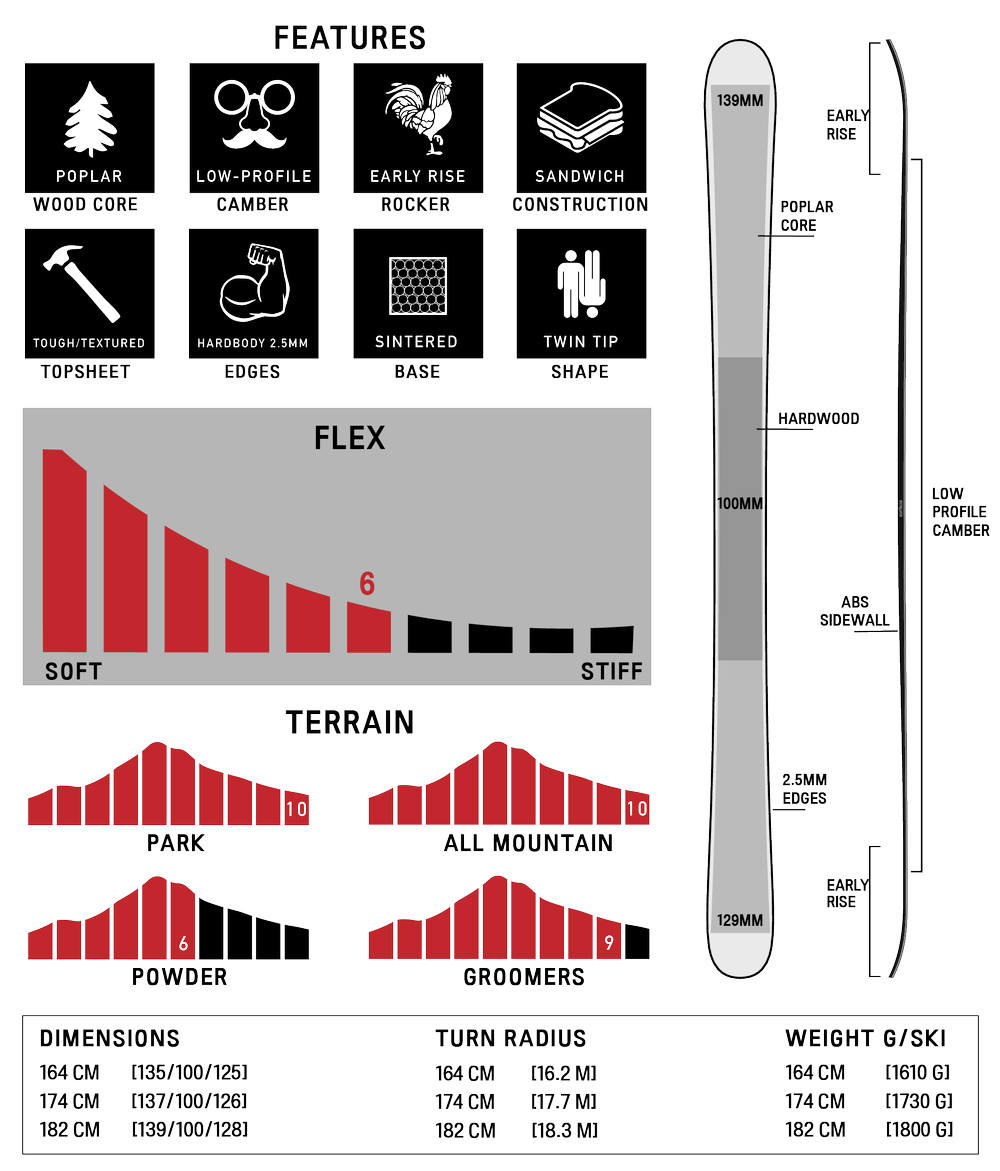 “A wide park ski shape designed to take down anything in it’s path, The Give'r is built with a poplar wood core, thick full wrap 2.5mm steel edges, reinforced hardwood underfoot, and a tough textured top-sheet for park/street durability, paired with hybrid “low-profile” camber + early rise and medium flex for all around responsiveness, stability, and control for carving, jumping, slashing, & jibbing around the whole mountain.”